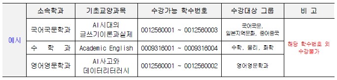 ※ 교과목별 수강대상 학과그룹[붙임2 참조]을 지정하여 편성된 시간표에 따라 본인