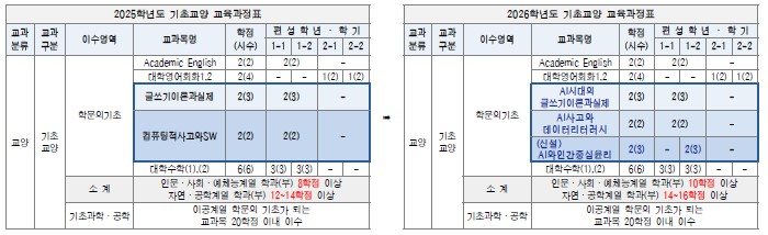 가. 교양 교과구분 및 이수영역 : [붙임1] 2026학년도 교양 교육과정표 참조
