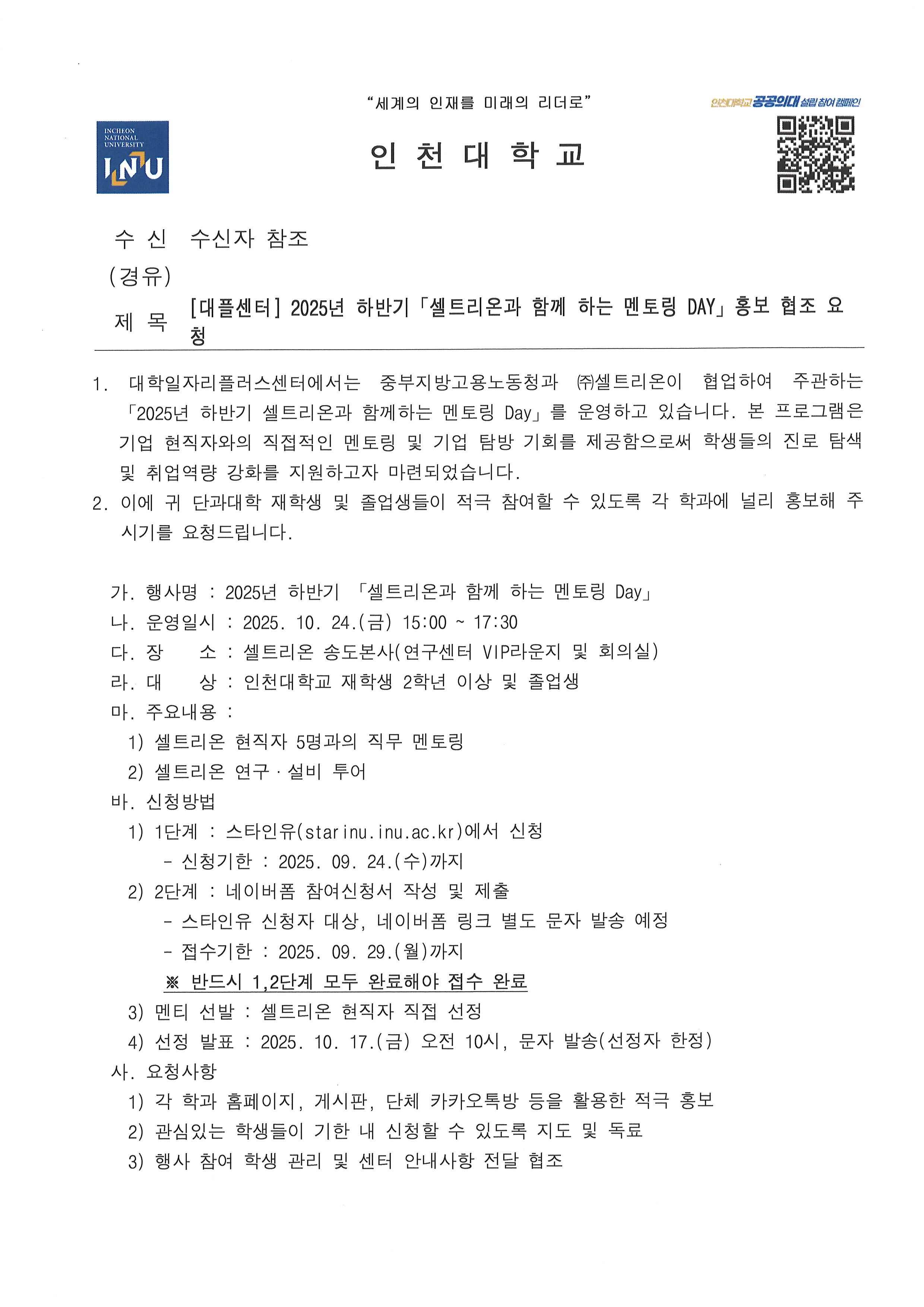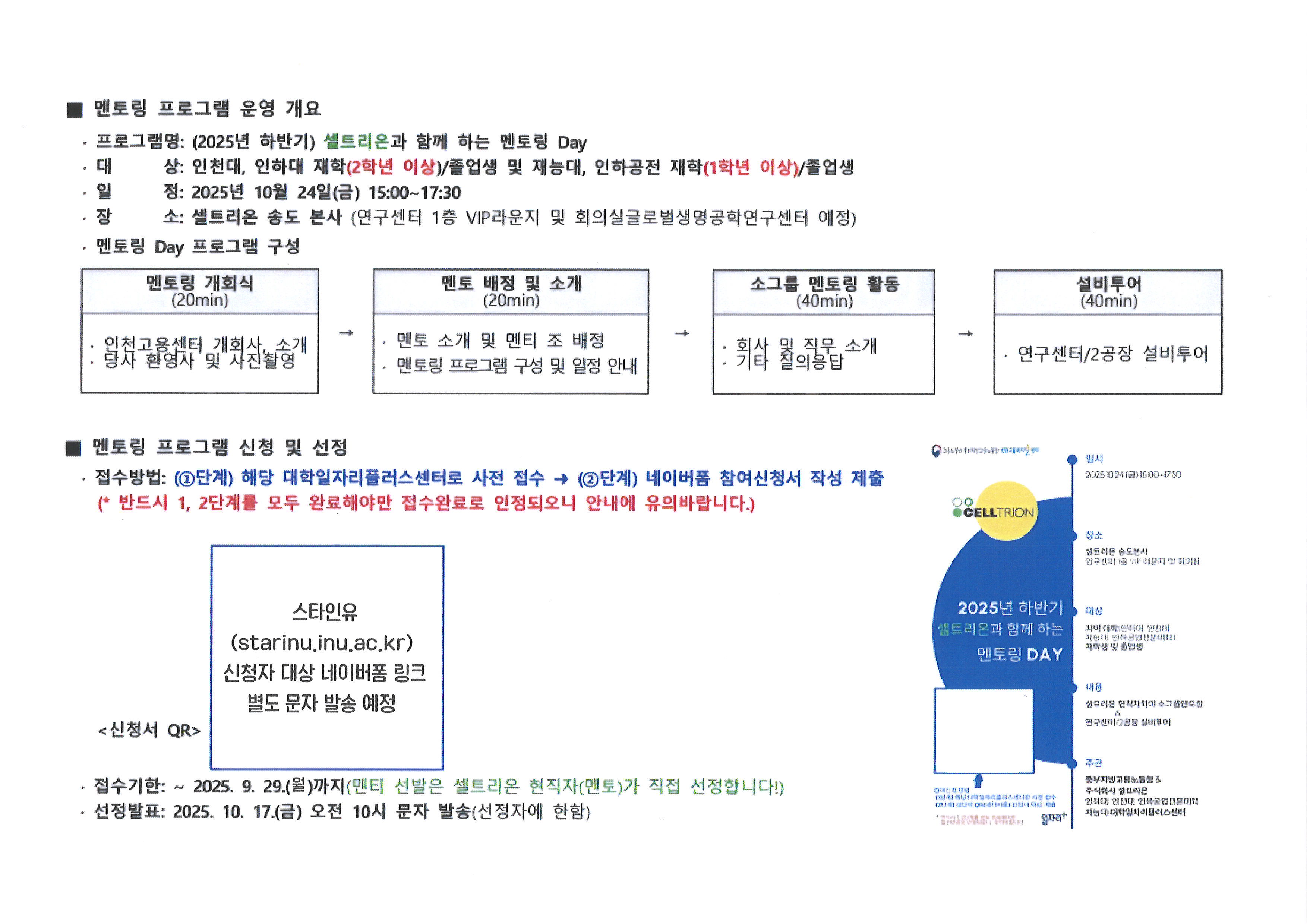 2025년 하반기 셀트리온과 함께 하는 멘토링 DAY 홍보 안내