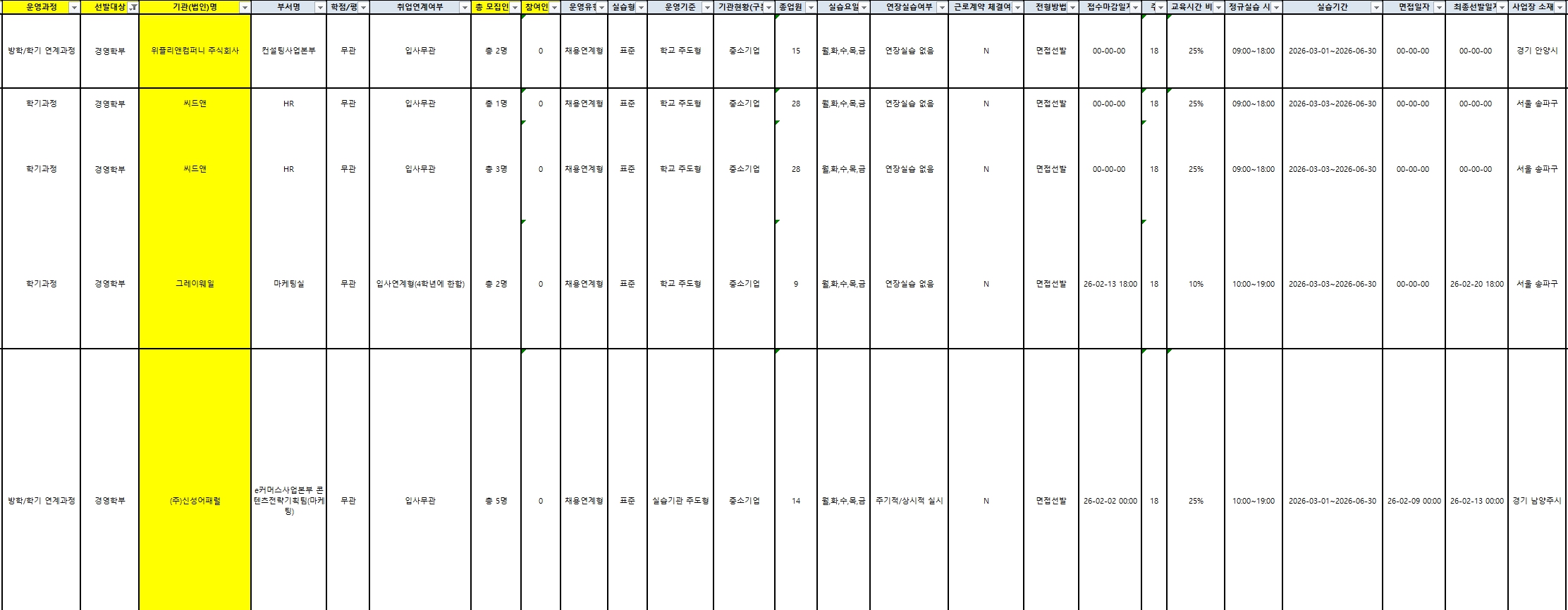 fnctId=bbs,fnctNo=987 2026-1학기 현장교육실스비 모집 기업 글번호 418192 작성일 2026-01-21 수정일 2026-01-21 작성자 경영학부 (032-835-8510, 8932, 8970) 조회수 117 2026-1학기 현장교육실습 모집 기업 안내입니다. 관심 있는 학생은 첨부문서를 참고하셔서 2월 6일 까지 신청하시기 바랍니다. 첨부파일 학과 및 학생_현장실습 지원신청서(필수).hwp 2026학년도 1학기 현장교육·실습 교과목 개설 신청 안내.pdf 2026-1학기 현장실습 참여기업 안내(홈페이지게시용).xlsx 다음글 이전글 [채용안내](주)루텍 2026년 정기공채 ROOTECH 신입경력사원 인재영입 채용모집 정종철 2026-01-19 11:43:13.0 목록