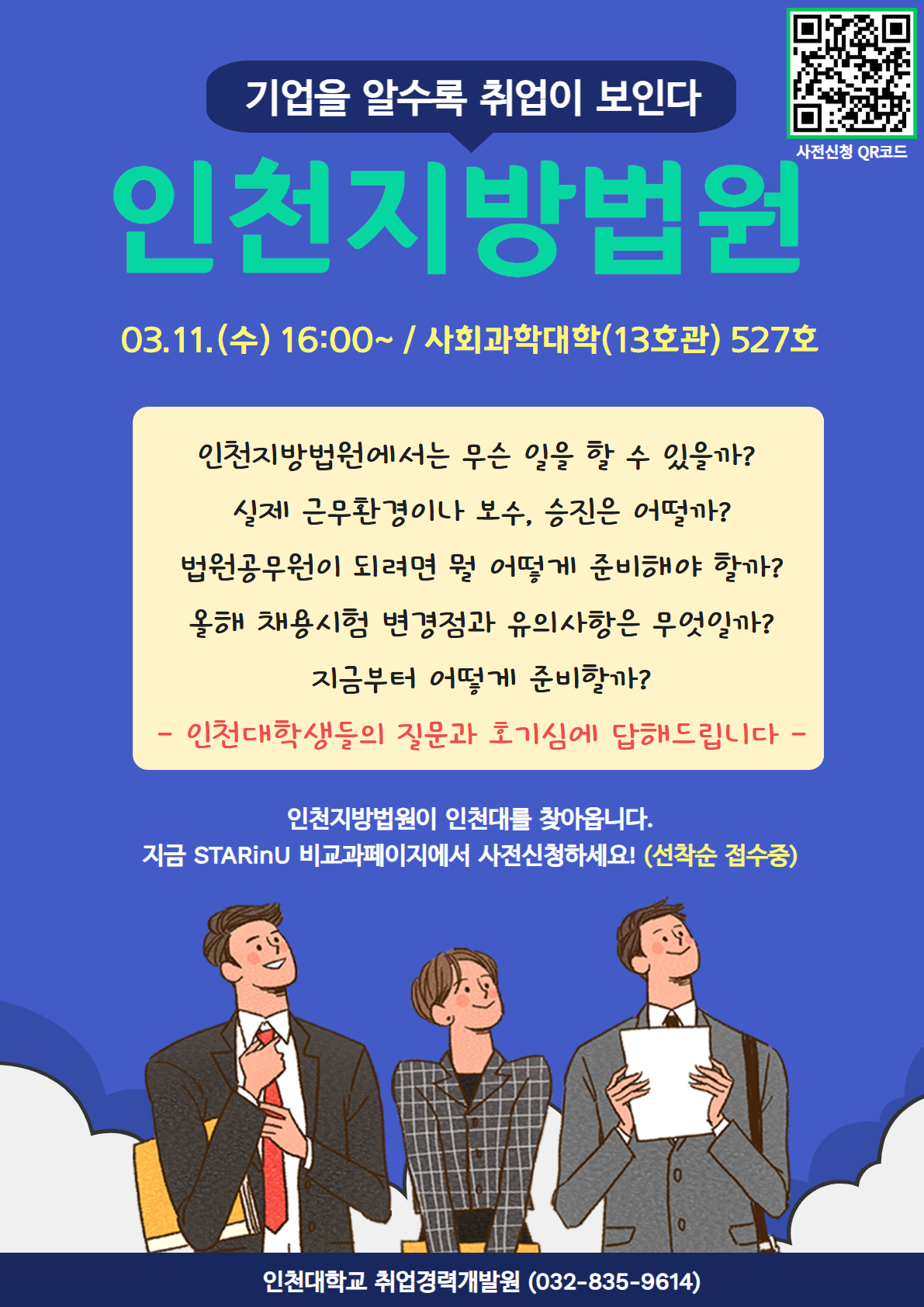 fnctId=bbs,fnctNo=987 인천지방법원 채용설명회 글번호 420708 작성일 2026-03-06 수정일 2026-03-06 작성자 경영학부 (032-835-8510, 8932, 8970) 조회수 206 첨부파일 첨부파일이(가) 없습니다. 다음글 [채용안내]한국건설기술연구원 정종철 2026-03-09 13:58:23.0 이전글 한미그룹 채용설명회 정종철 2026-03-06 14:45:20.0 목록